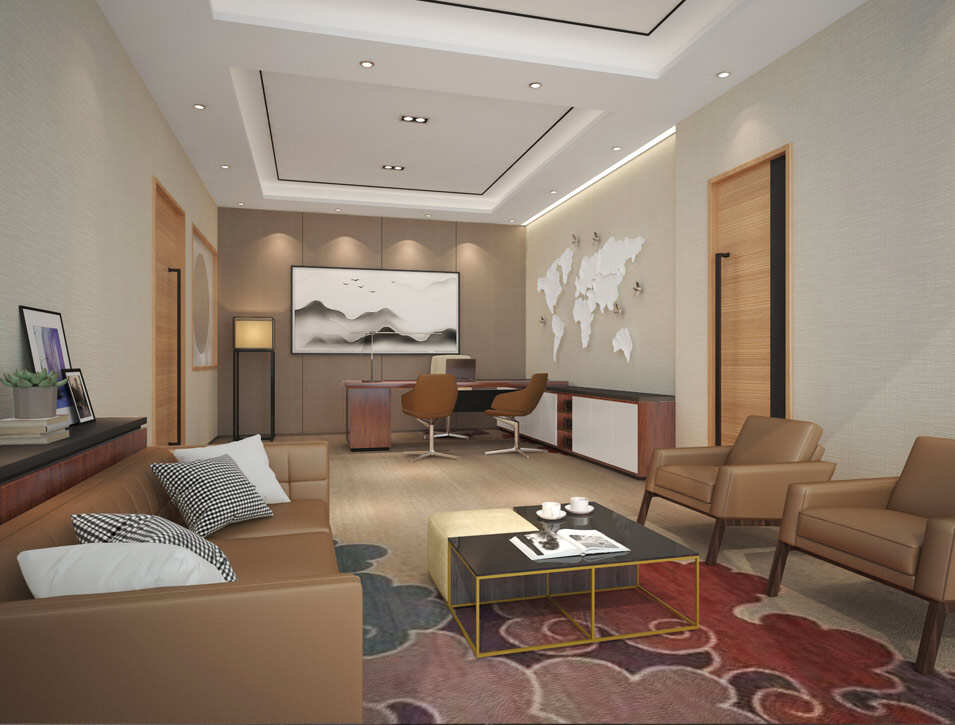 设计介绍:现代办公室装修风格,根据公司的产品特点,选用白色,棕黄色为主,前台原生态的木桩凳子、木色前台桌,纹理的地板搭配不一样的风格,会议室注重采光,顶部明亮的灯,通透的玻璃可以光引到空间里,领导办公室墙壁上挂着写意画十分有艺术感,棕色的皮质从色彩效果来讲,棕色也是百搭的不二之选,为领导的空间带来一定品质感。