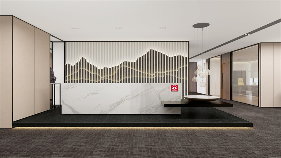 设计介绍:主要展示前台、洽谈区、走廊、贵宾区、会议室、办公区等各个区域实物图,设计师们采用现代简约风格办公室设计,主要以白色为主,蓝色更符合智能化科技的公司形象,通过几何图形与条纹装饰打造科技智能的办公空间。