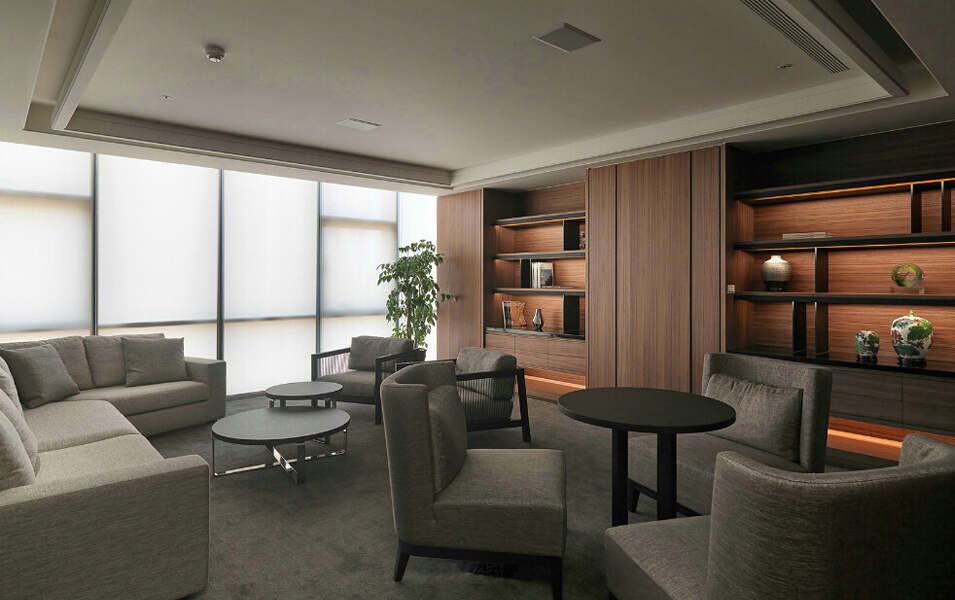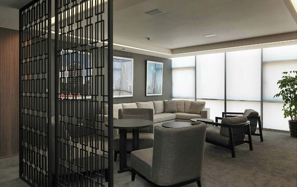 设计介绍:灰色为主,黑色的座椅,典雅,复古的墙砖铺设,简约靓丽的吊灯配饰,舒适优雅,屏风阻隔,办公室内物质美学原理与古朴中式意蕴互相糅合更有中国风儒雅,凝重现代气质。